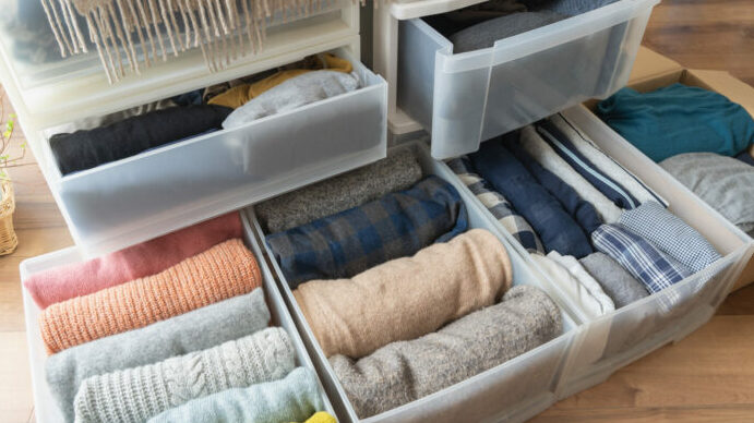 カテゴリーごとに分けた衣服を、見やすく整理して収納します。例えば、季節ごとに透明な収納ケースに分けておくと便利です。
