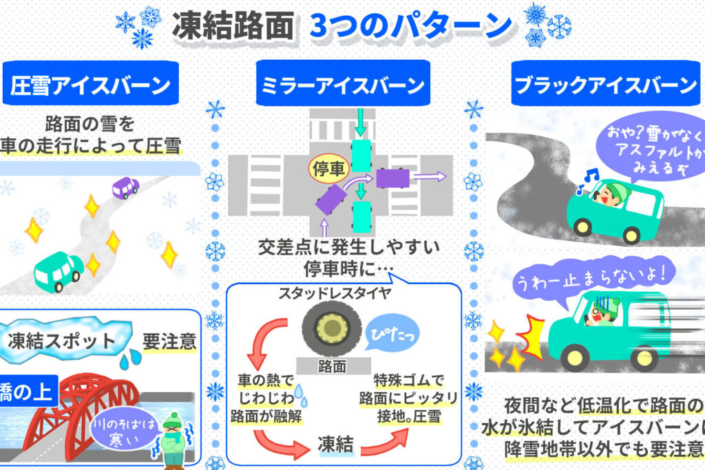 路面凍結は運転中の安全性に大きな影響を及ぼす。特にノーマルタイヤの場合、凍った道路での運転はリスクが高まる。以下に、凍結路面の影響とその注意点を示す。