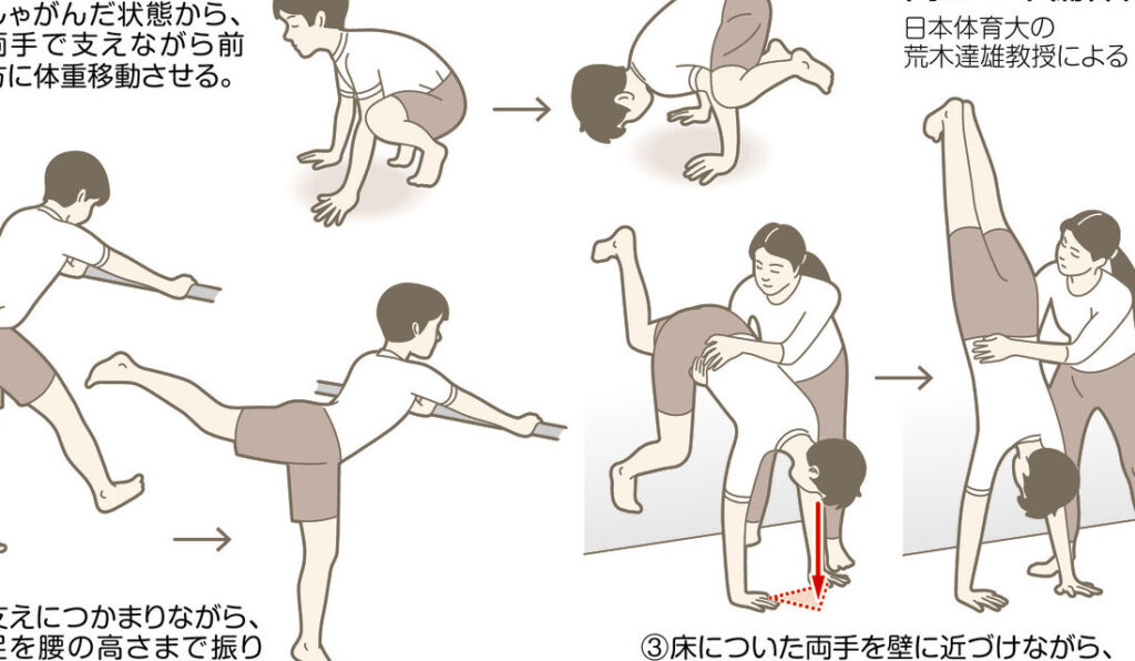 - 段階的に練習を進める。基本的な姿勢が安定したら、徐々に自立した倒立を目指す。
