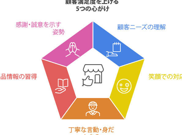 - 笑顔を絶やさない。第一印象は非常に重要です。顧客が入店した瞬間から、笑顔で迎えることが基本です。