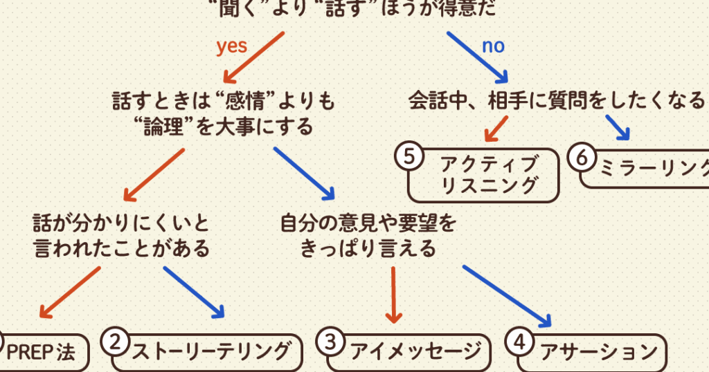 - 相手の話を最後まで聴く。 話を遮らず、注力して聞くことで、相手の伝えたいことを理解する。