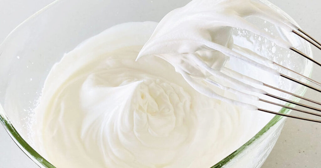 - 泡の状態を確認する。ホイップがクリーミーになり、ツノが立つまで続けます。