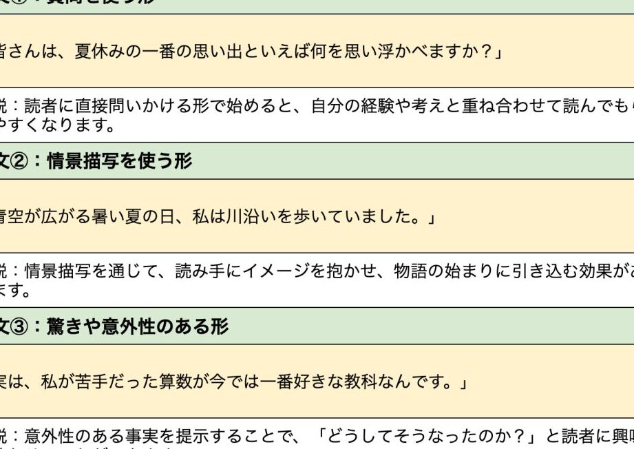 - 導入部分を工夫する。読者を惹きつける文章を書き出すことで、関心を持ってもらう。
