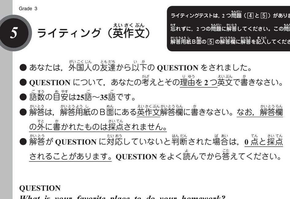 - 自由作文: 自分の意見や経験を書きます。トピックは日常的な内容が多く、2〜3段落で構成されることが一般的です。