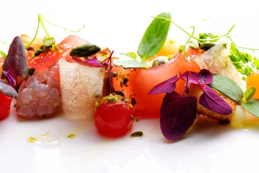 - 薄切りの技術。魚を薄く切ることで、繊細な印象を与え、盛り付け後の美しさを強調できる。