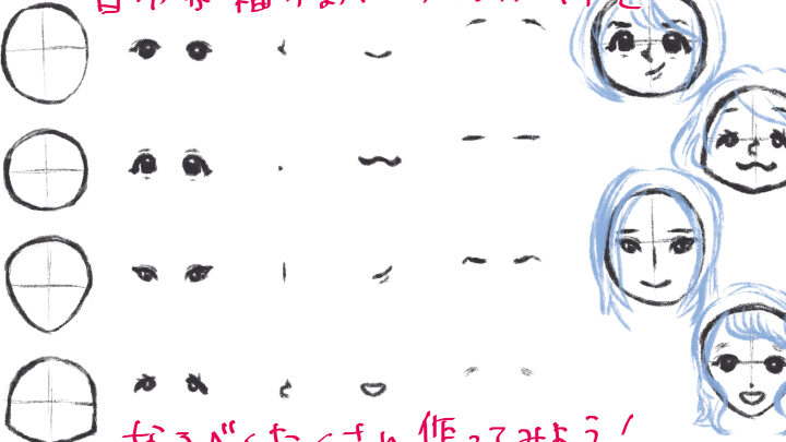 - 目、鼻、口の位置を決める。顔の比例を考えながら配置し、適切なバランスをとる。