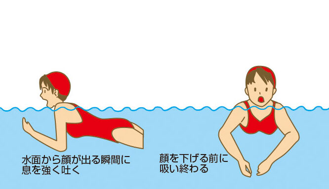 - 息を吸ったら、再び頭を水中に戻し、吐き出す。水中で無駄な力を使わずに呼吸を行いましょう。