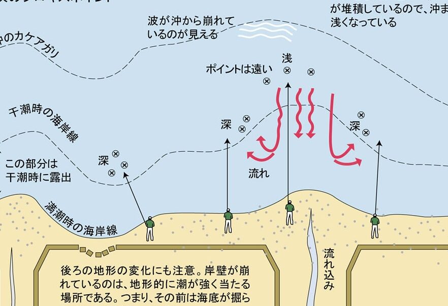- 釣り場を選ぶ。波際や砂浜が理想的なポイントです。