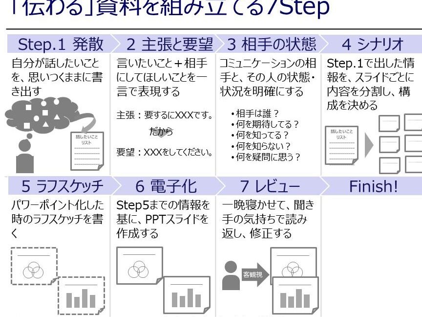 - 信頼感を高める。整理された内容は、発表者への信頼を増します。