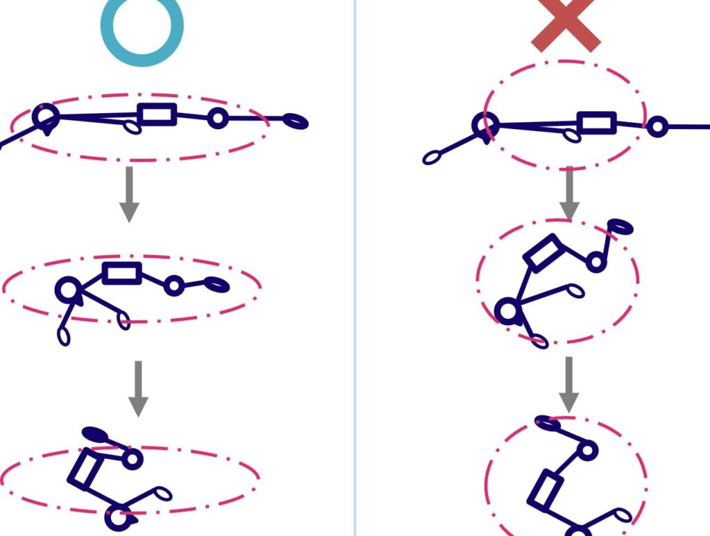 - 腕を使ってスムーズな動作を心掛ける。腕の位置が体の回転を助けます。