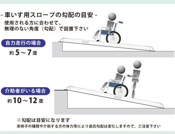 - 適切なスロープの角度を確認する。スロープは、1:12の比率で設計されていることが理想的です。これにより、段差を安全に越えられます。