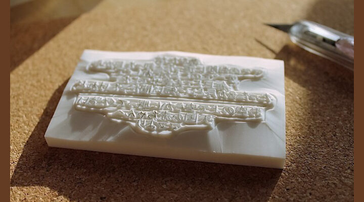 - 文字の彫刻 – スタンプ用ナイフを使って、慎重に文字を彫ります。力を入れず、穏やかな手つきで行います。