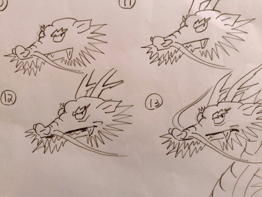 - 基本形を描く。 龍の体型、頭、尾の大まかな形を描き始めます。