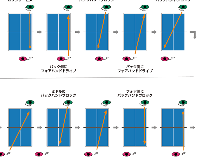 - 相手のスタイルを分析する。 相手のショットパターンや弱点を把握する。