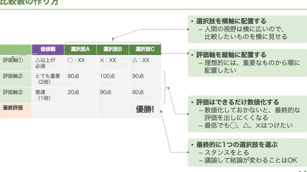 - 視覚的要素を追加する:色分けやアイコンを使って、重要な情報が一目でわかりやすくする工夫をします。例えば、最も優れている項目にハイライトを付けることが有効です。