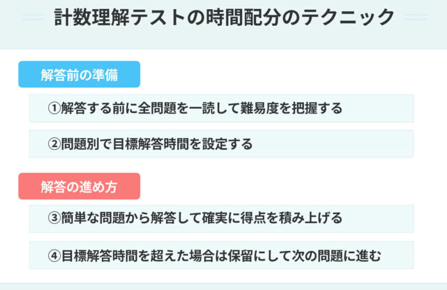 計数理解テストは、数学的知識だけでなく、情報を解析し、適切な判断を下す力も重視します。このテストには以下の特徴が含まれます。