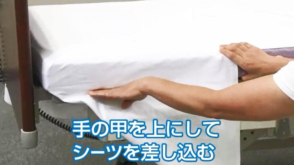 - シーツを広げる。ベッドのマットレスにシーツをしっかりと広げます。