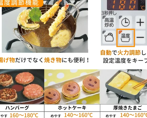- 160〜180℃が天ぷらの理想的な揚げ温度です。この温度帯で揚げると、食材がきれいに揚がります。