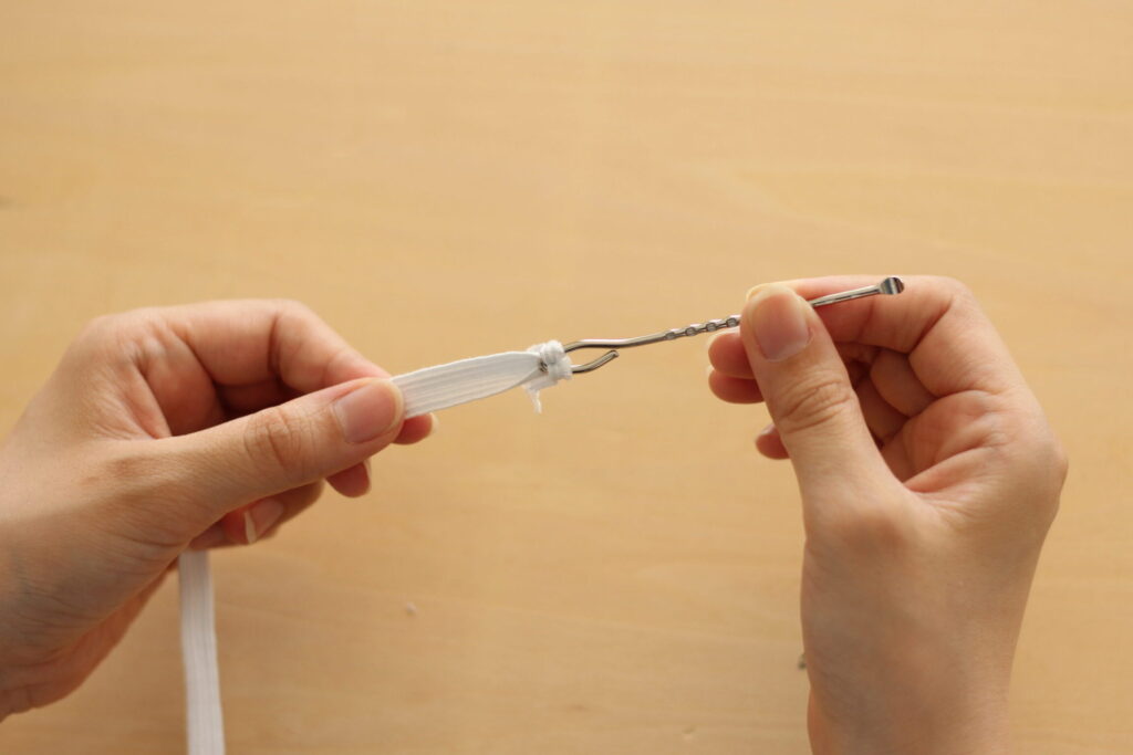 - ゴム通しにゴムを取り付ける。 ゴムの端を通し、固定します。