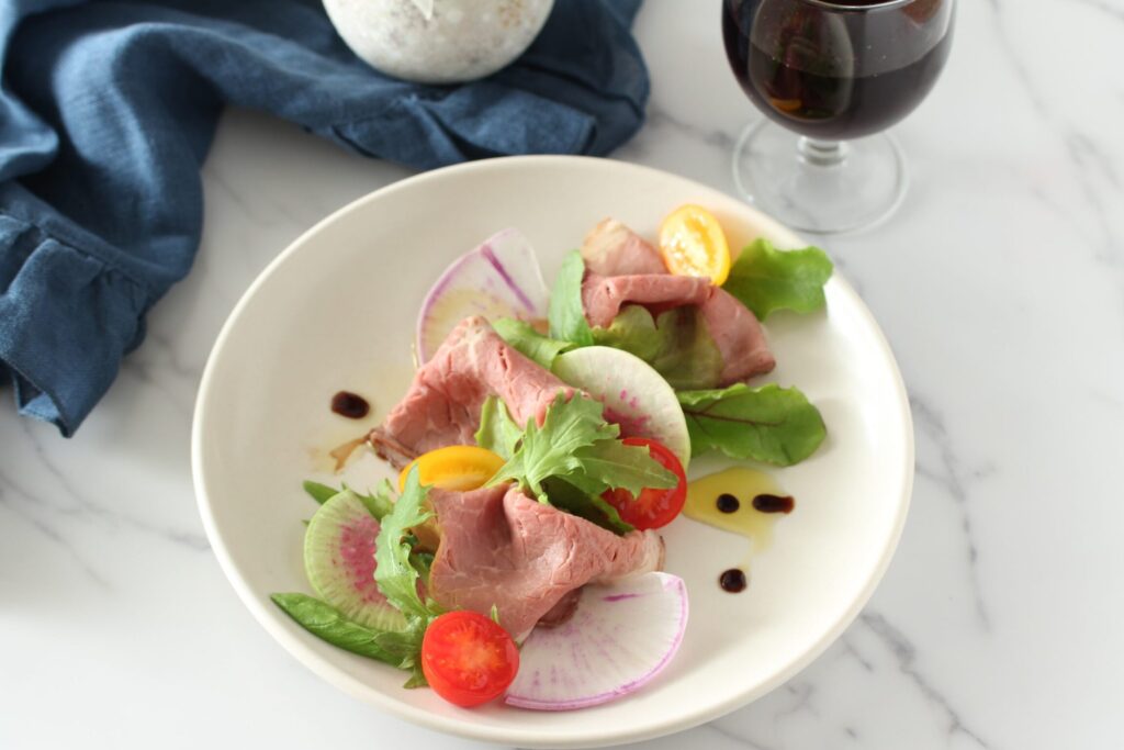 お皿の選択は盛り付けの重要な要素です。適切なお皿を選ぶことで、ローストビーフの魅力が引き立ちます。