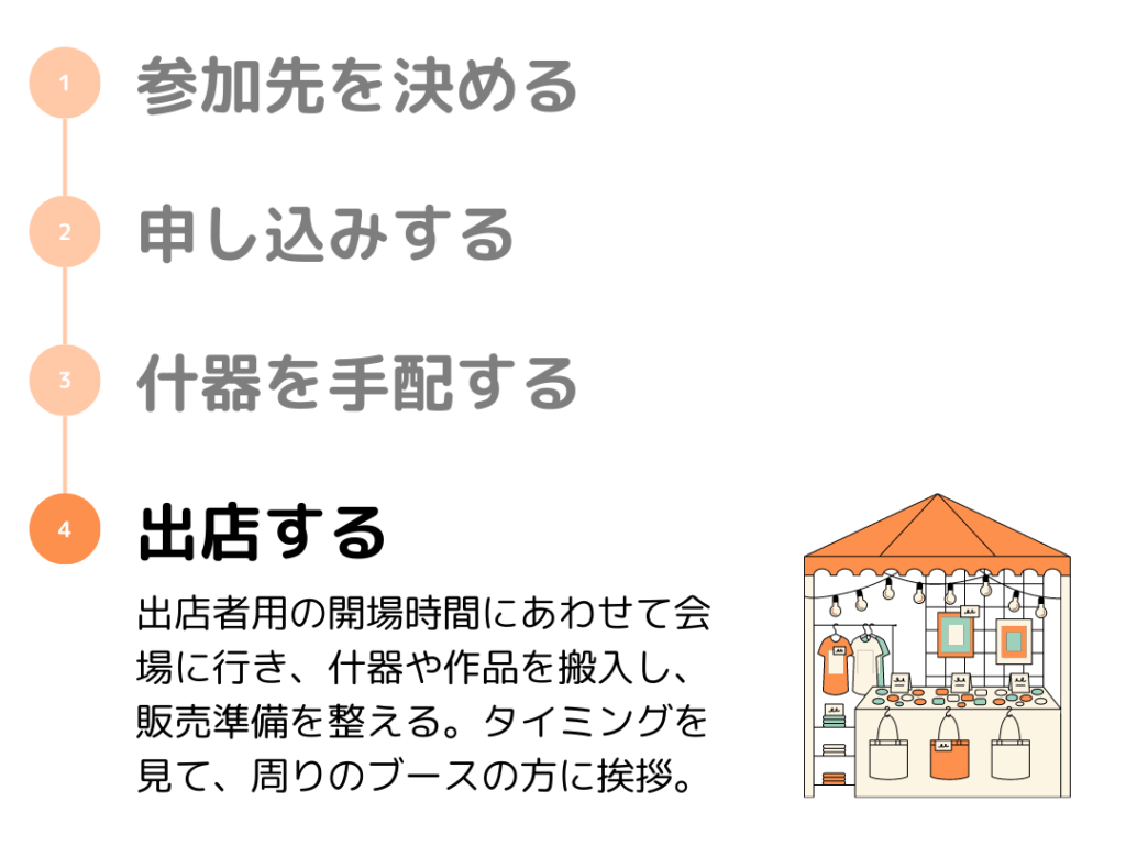 - 地域のイベントに参加する。ハンドメイドマーケットに出店して直接販売する。