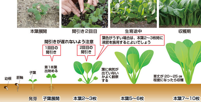 - 葉が6〜8枚になるまで待つ: 小松菜が成長して、葉がしっかりと育ったら収穫の時期です。この状態は約30〜40日後です。