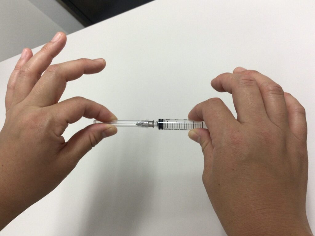 - 注射針をしっかりと持つ。 親指と人差し指で注射針の筒をしっかりとつまみます。
