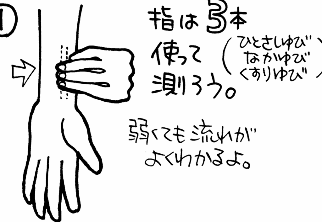 - リズムを感じ取る。 拍動のリズムを感じながら、心拍数を測定します。