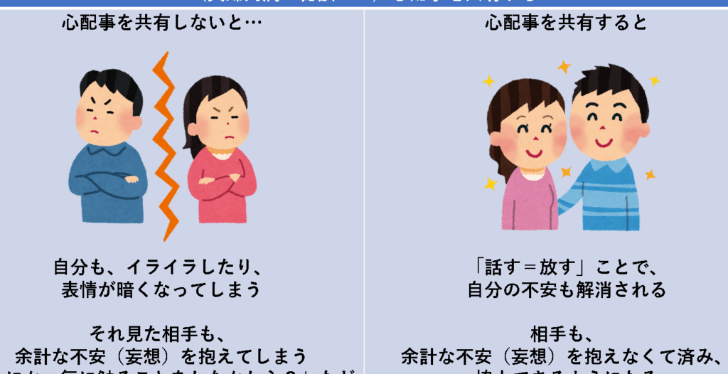 - 共有すべき情報を見極める。 お互いが知っておくべきことと、プライバシーとして保つべきことを整理します。