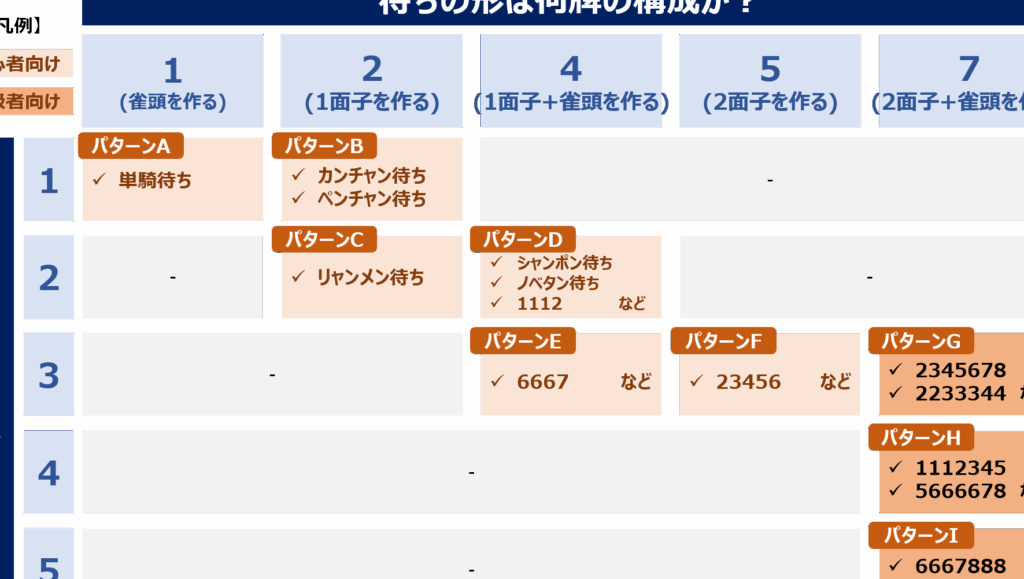 - 具体的な待ち牌の把握: 各役に必要な牌の組み合わせを一覧にする。