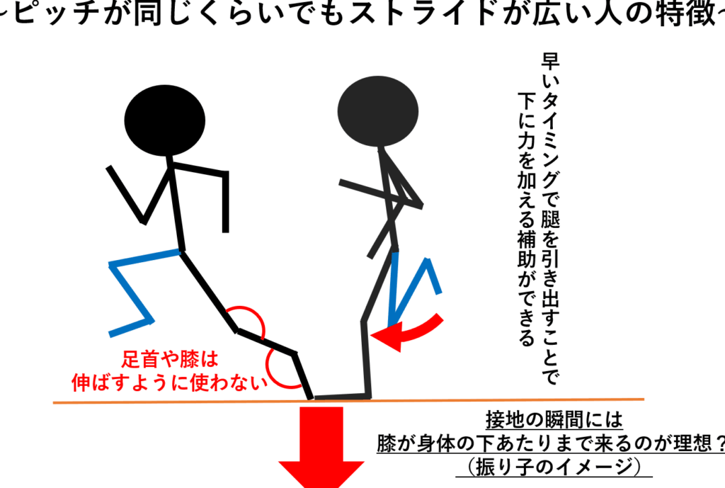 - ピッチ走法は短いステップを取る。ピッチ走法では頻繁に足を動かすが、ストライド走法では大きなストライドを意識する。