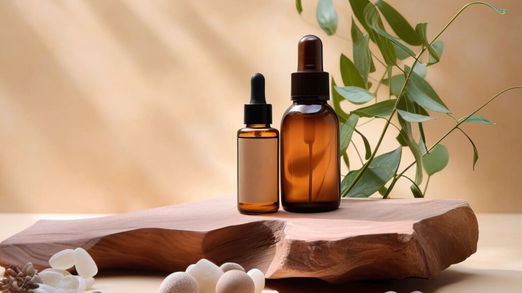 - 背景を整える。 単色の背景や質感のある布を使い、化粧品が際立つようにします。