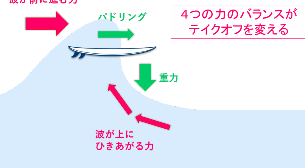 - パドリング速度を上げる。波が来る直前に最大のスピードを発揮することがカギです。