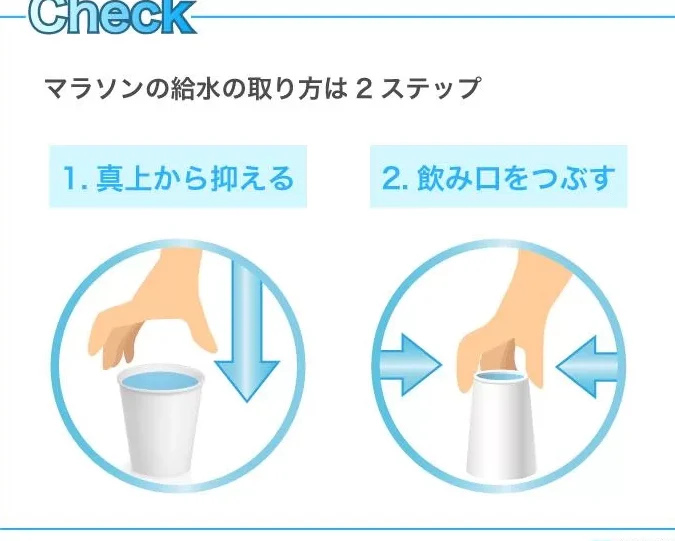 - 給水のタイミングを確認する:レース中は、特に10kmごとに200ml程度の水分を摂取することをお勧めします。喉が渇く前に飲むことが大切です。
