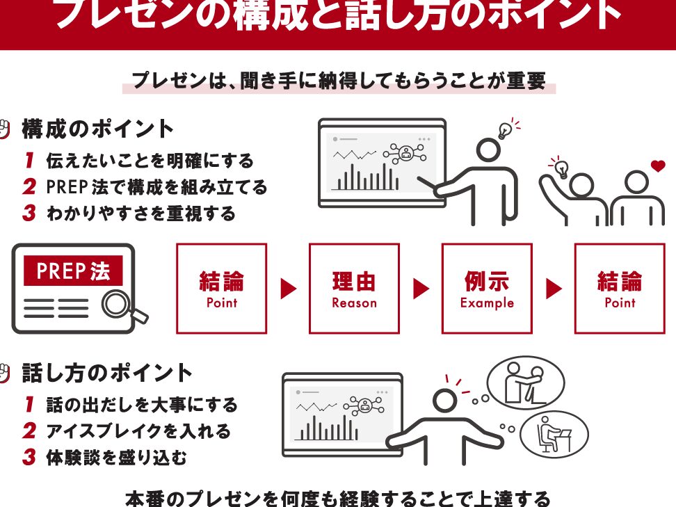- 論理的な流れを作る。各要点を自然に繋げ、聴衆が理解しやすい構成を意識します。