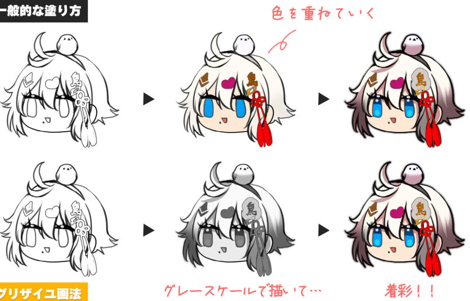 グリザイユ画法は、特定の手法を通じて独特な効果を生み出します。以下の技術を使用して、作品に立体感や深みを持たせる方法を説明します。