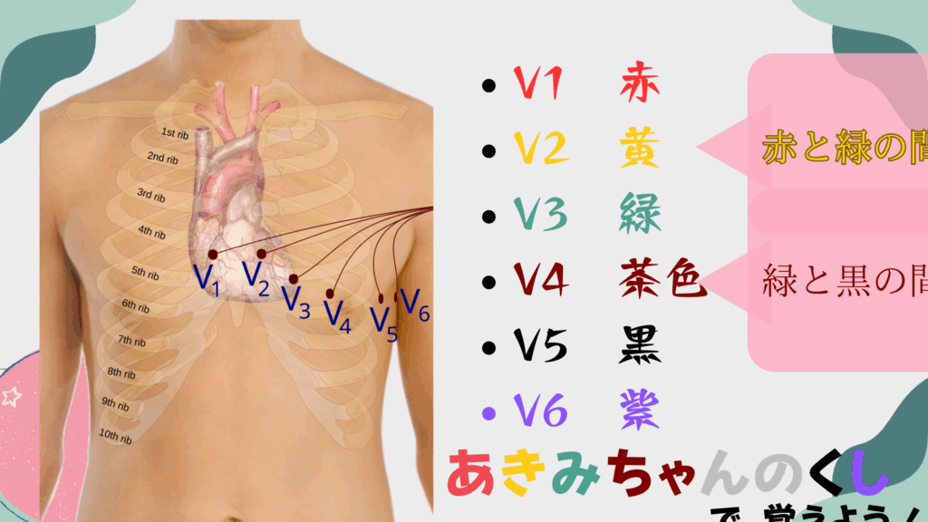 正確な十二誘導心電図を取得するためには、適切な貼り方が必要です。以下に、基本的な手順を示します。